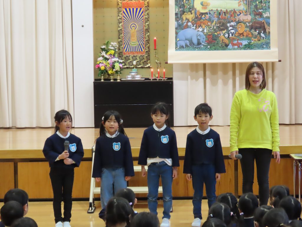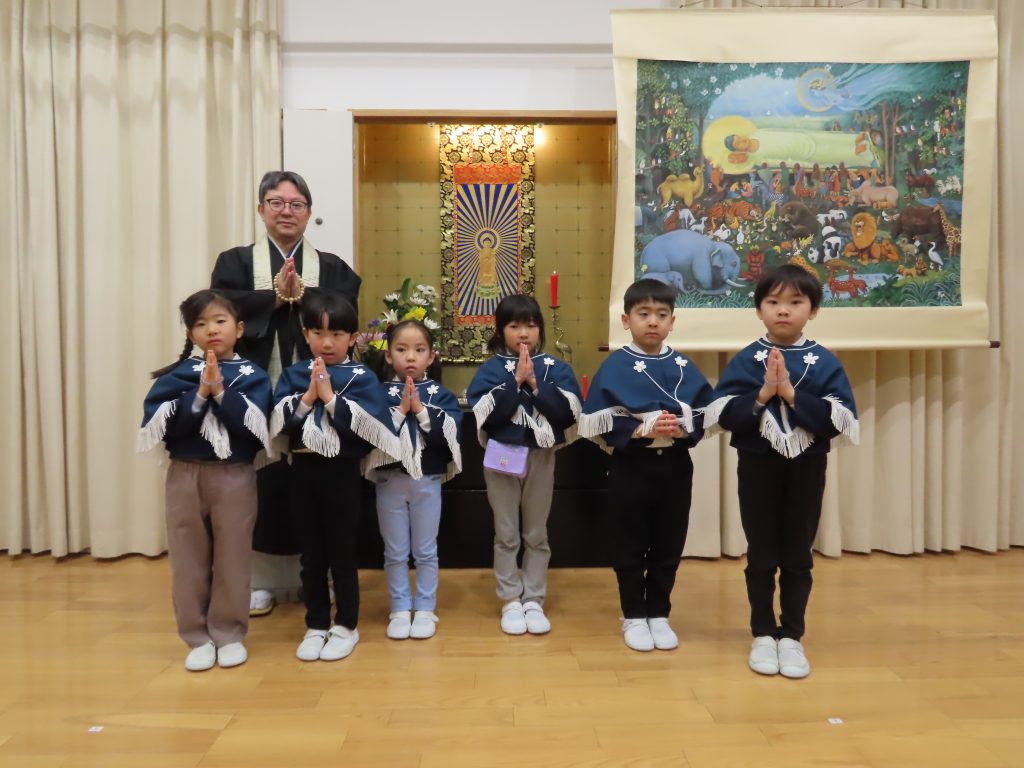 年長が、「お釈迦様がお亡くなりになった日です。教えを聞いて、はじめの一歩にチャレンジします!」など、みんなの前で言葉を言ってくれました。