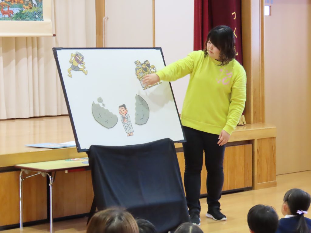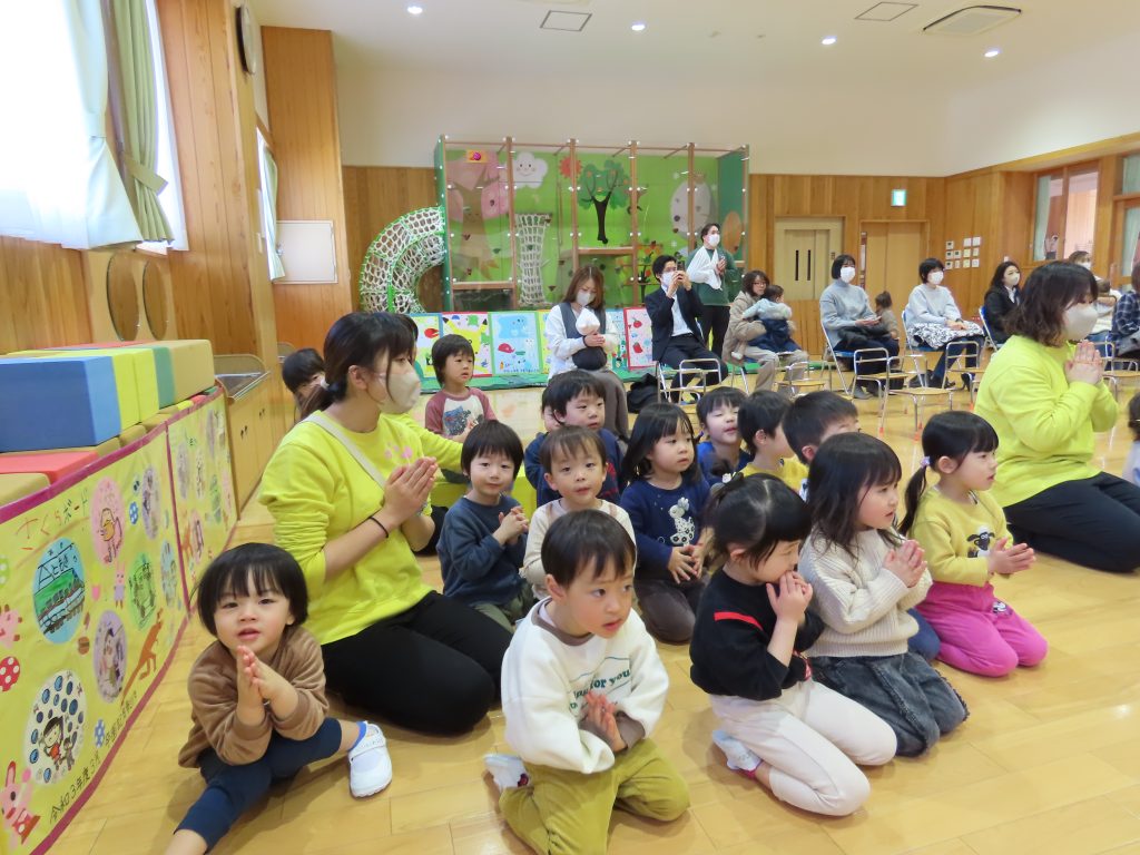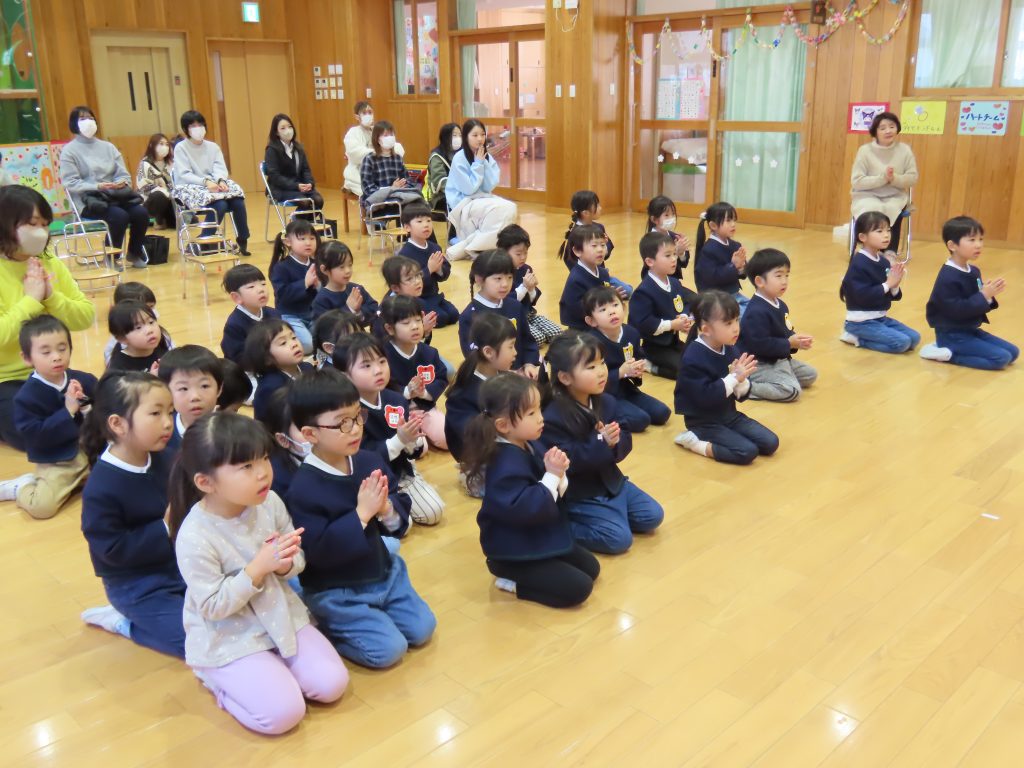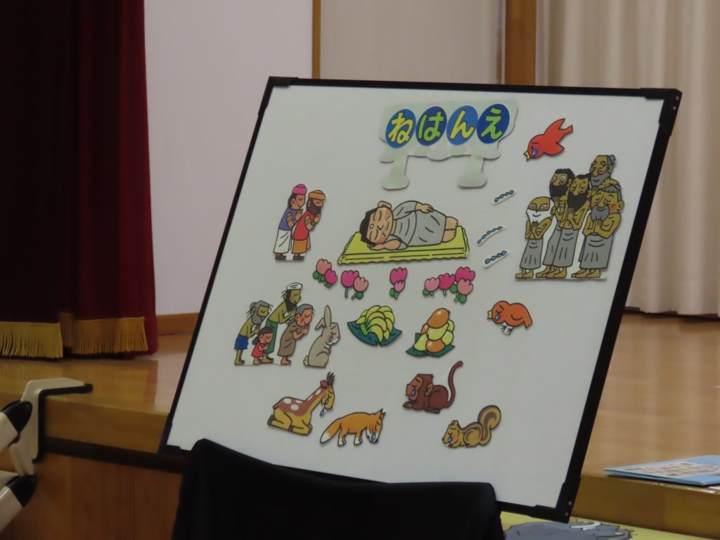 涅槃会のパネルシアターをじっと見て、お話をよく聞いていました。つぼみ組さんも参加した3学期の姿です。