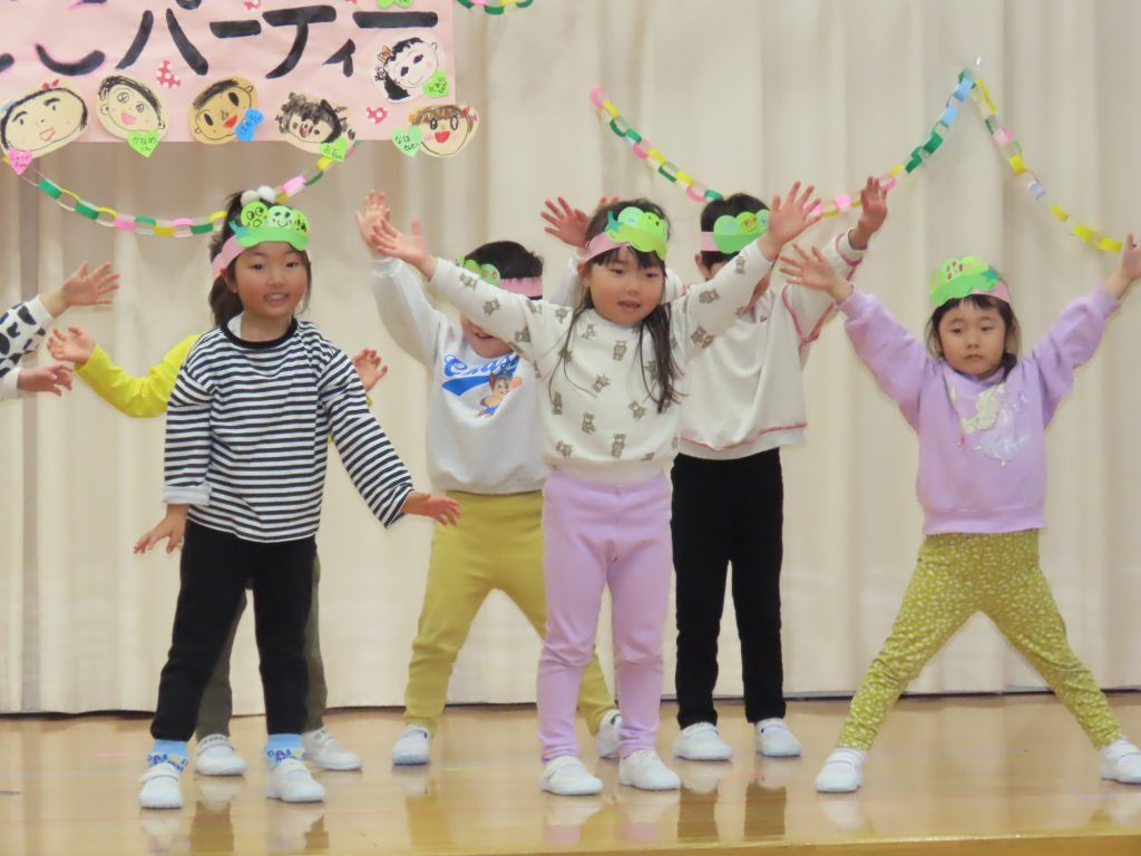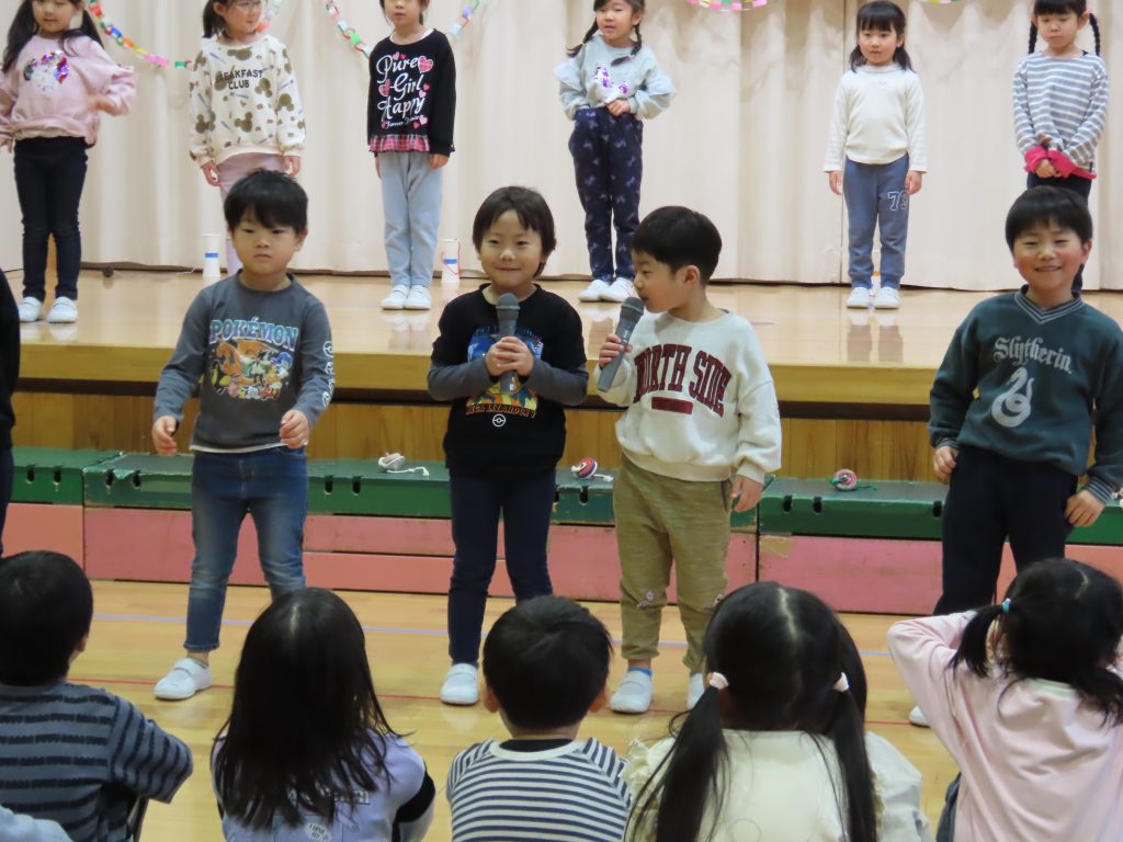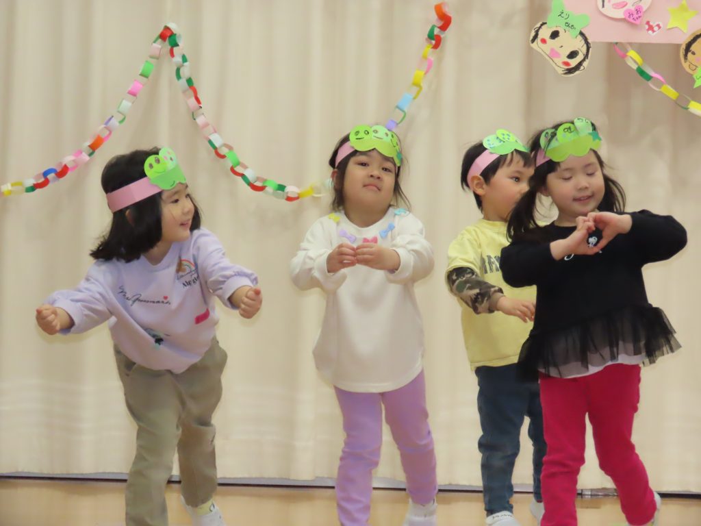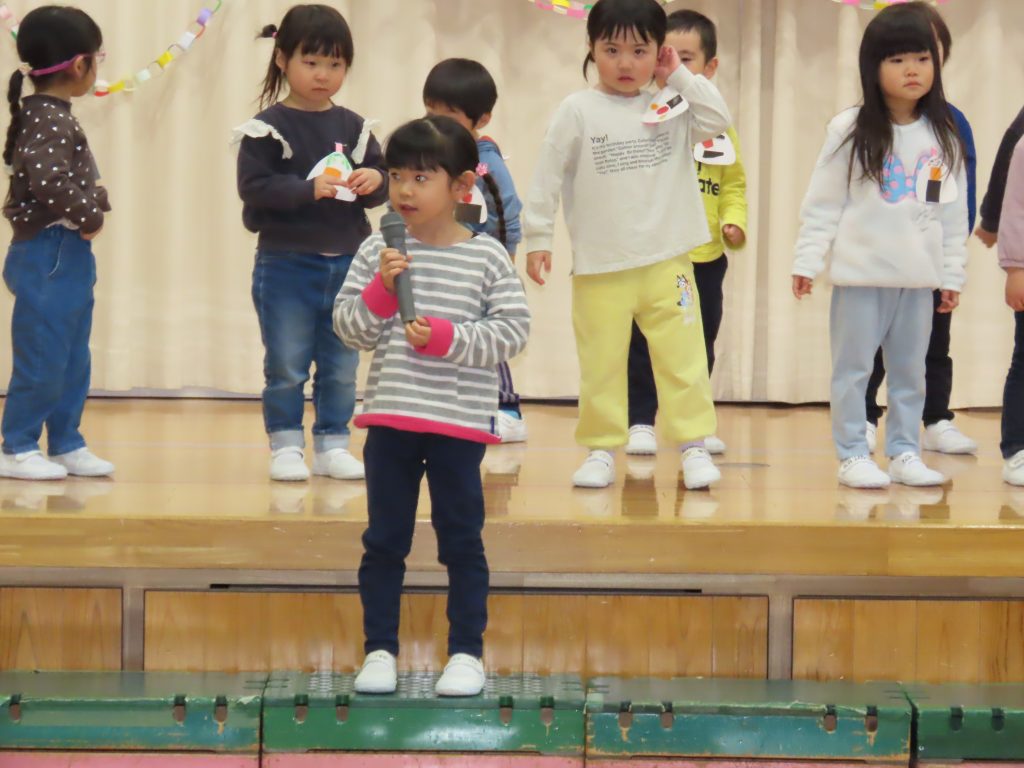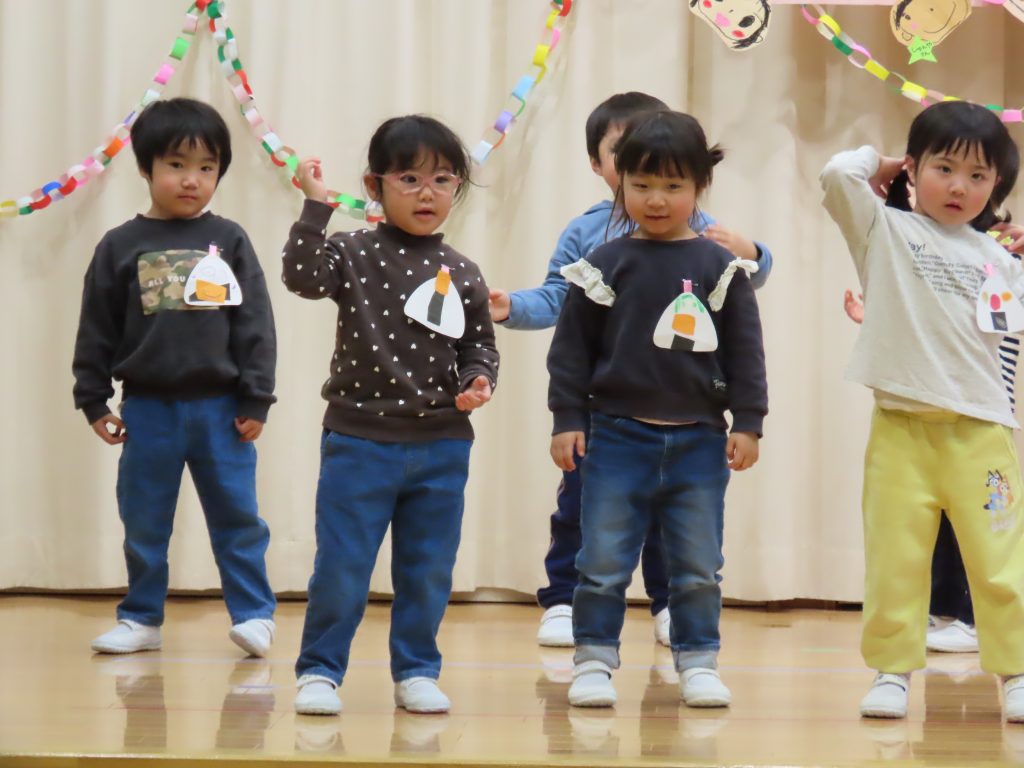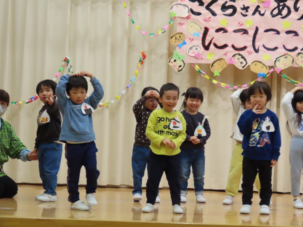続いて、うめ組1組の『お豆戦隊ビビンビーン』と、2組の『うめおにぎりメドレー』を発表です。『お豆戦隊ビビンビーン』は、自信満々、元気いっぱい踊ってくれました。『うめおにぎりメドレー』はさくらさんが成道会で発表したオペレッタでした。教えてもらったり、一緒に踊って覚えた踊り。おにぎりバッチもかわいい。「さくらさんあそんでくれてありがとう!」とメッセージを聞くと沢山の拍手が響きました。