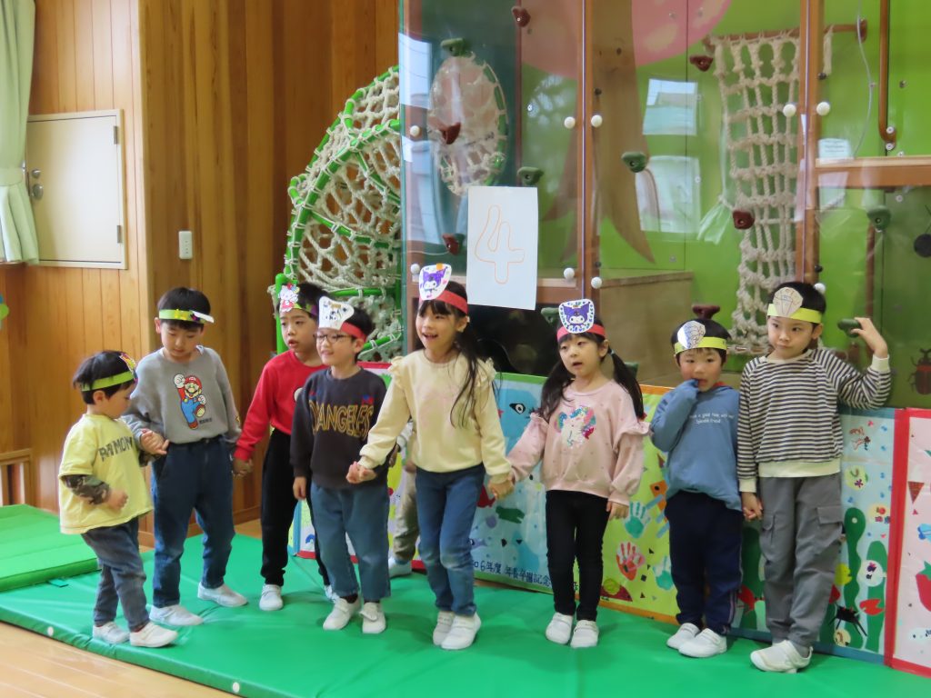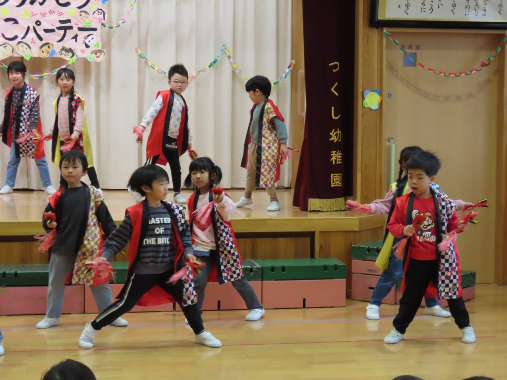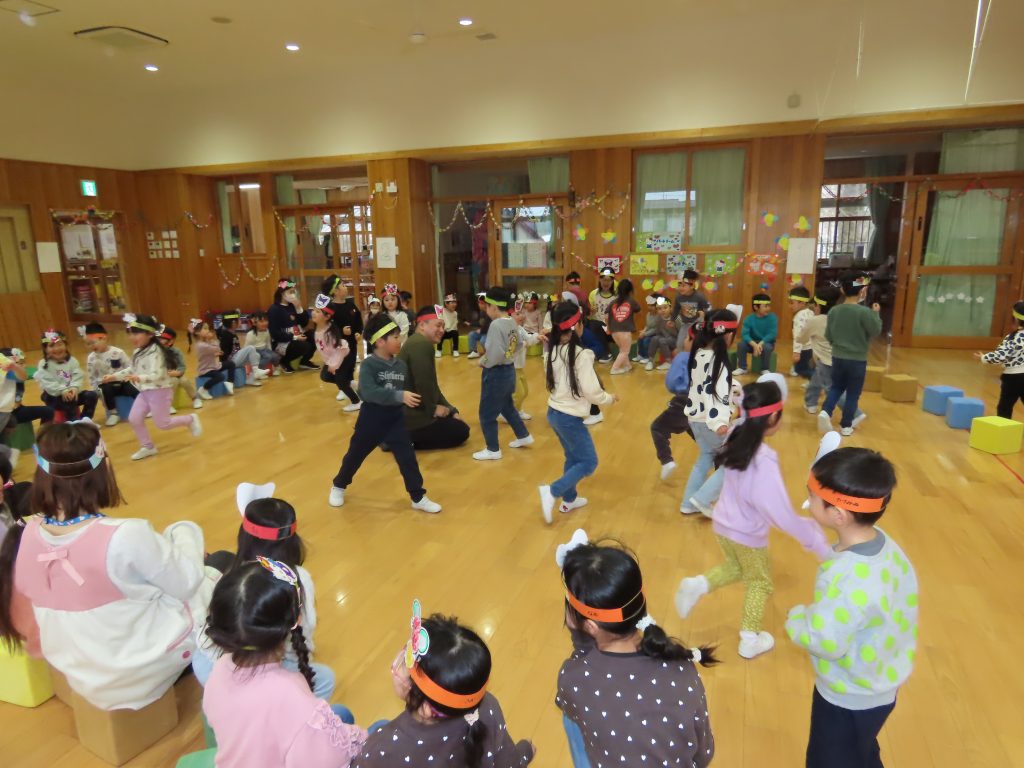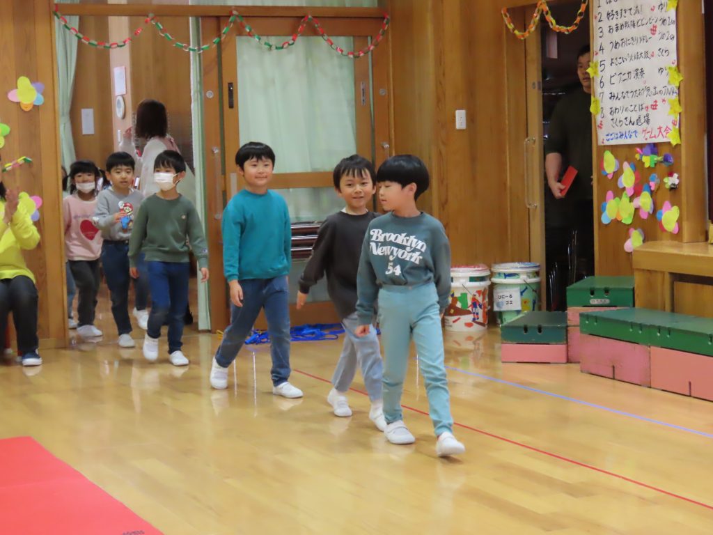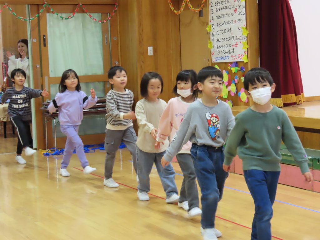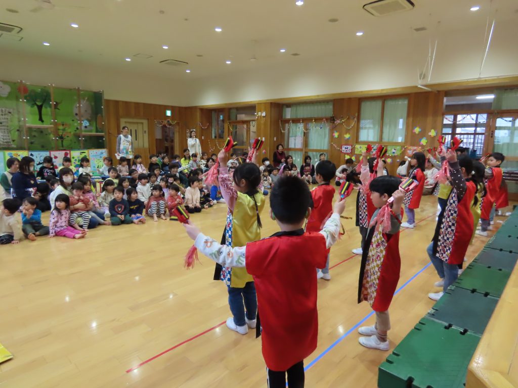 続いて、うめ組1組の『お豆戦隊ビビンビーン』と、2組の『うめおにぎりメドレー』を発表です。『お豆戦隊ビビンビーン』は、自信満々、元気いっぱい踊ってくれました。『うめおにぎりメドレー』はさくらさんが成道会で発表したオペレッタでした。教えてもらったり、一緒に踊って覚えた踊り。おにぎりバッチもかわいい。「さくらさんあそんでくれてありがとう!」とメッセージを聞くと沢山の拍手が響きました。