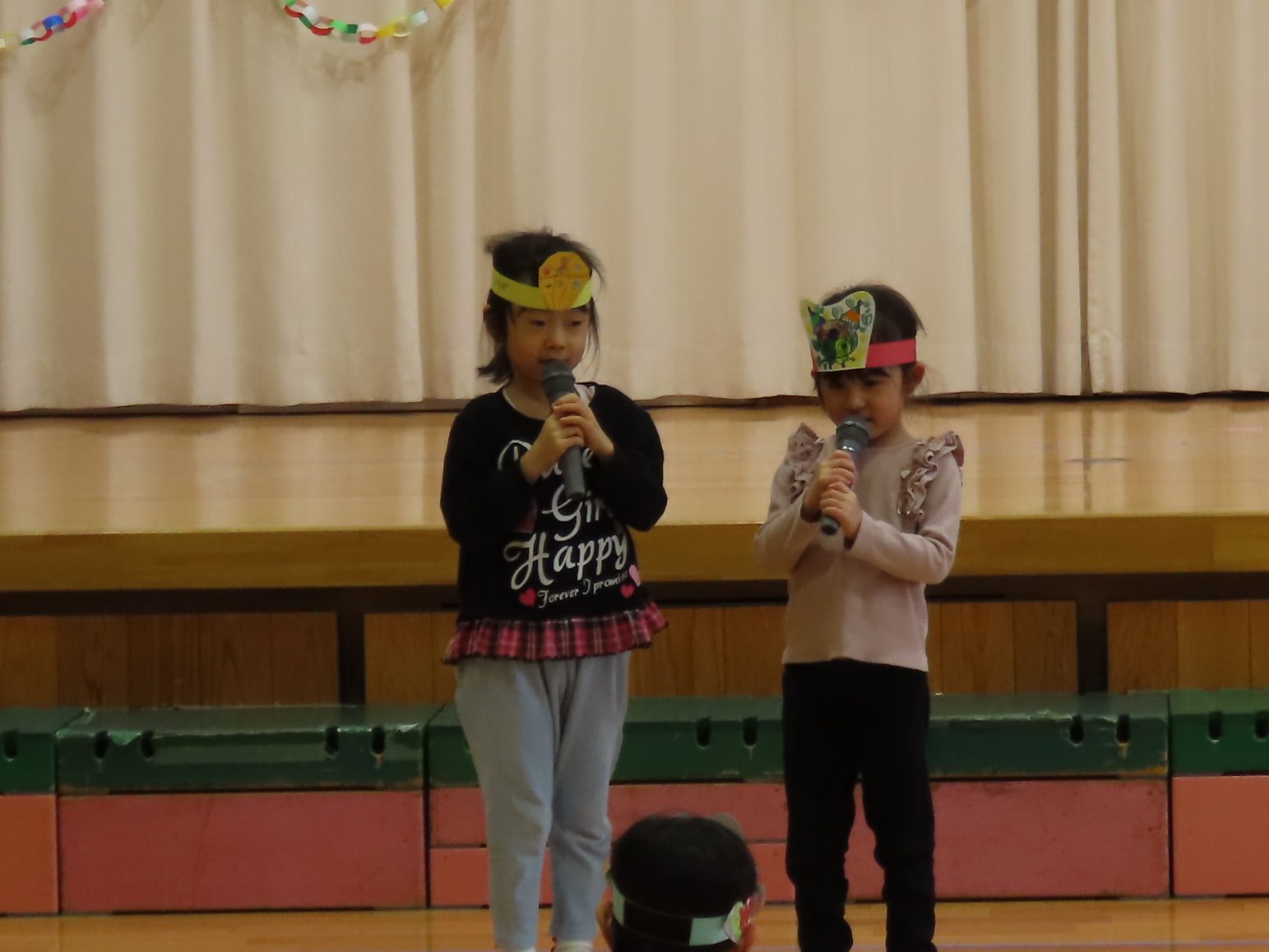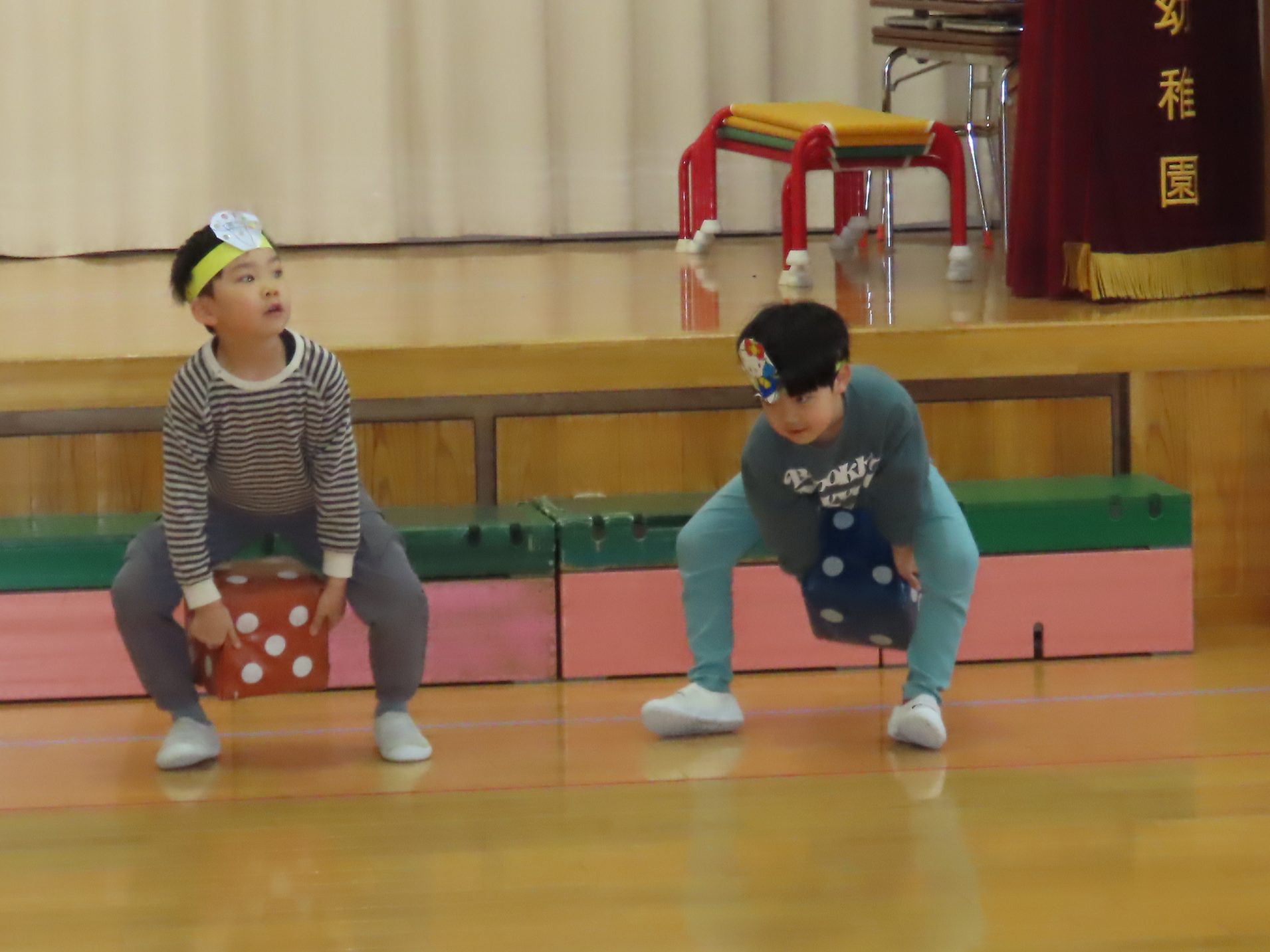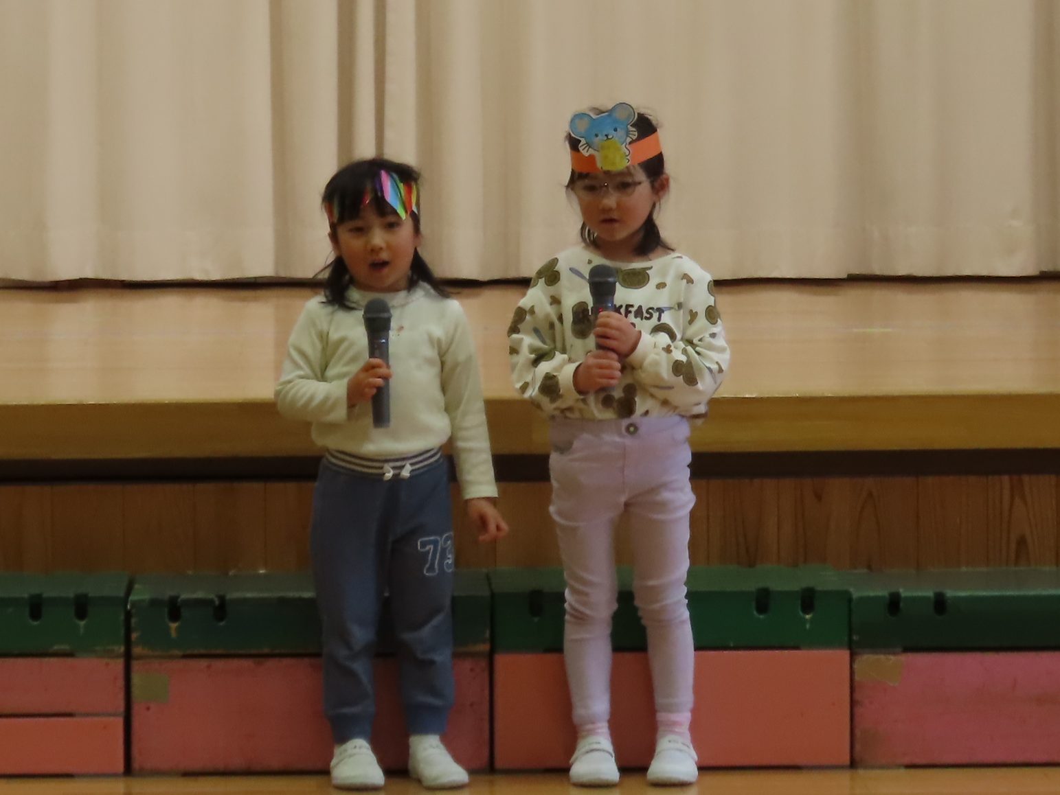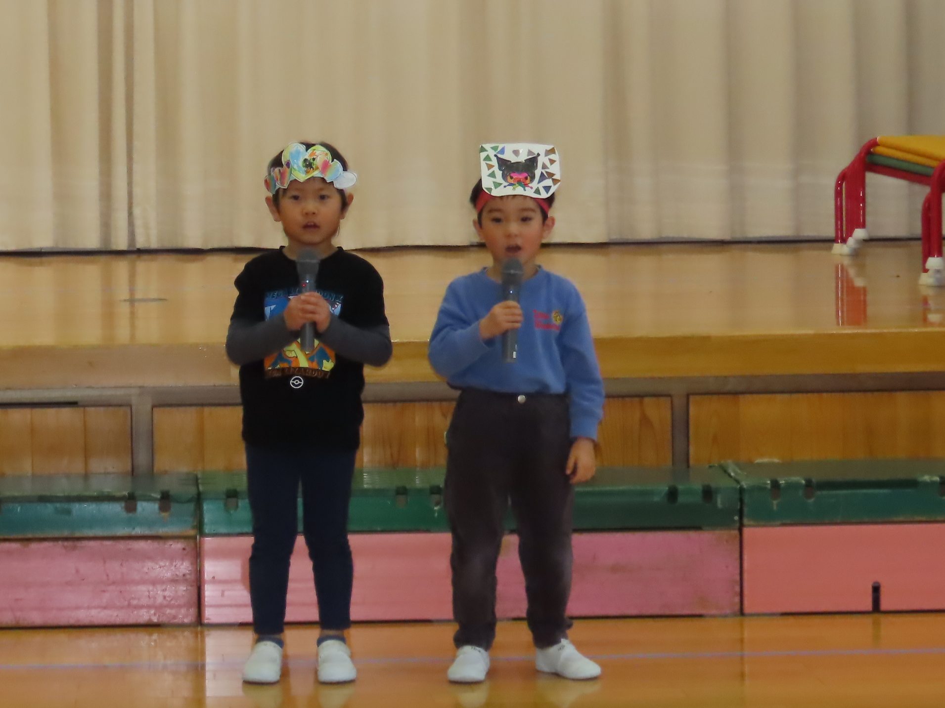 続いて、うめ組1組の『お豆戦隊ビビンビーン』と、2組の『うめおにぎりメドレー』を発表です。『お豆戦隊ビビンビーン』は、自信満々、元気いっぱい踊ってくれました。『うめおにぎりメドレー』はさくらさんが成道会で発表したオペレッタでした。教えてもらったり、一緒に踊って覚えた踊り。おにぎりバッチもかわいい。「さくらさんあそんでくれてありがとう!」とメッセージを聞くと沢山の拍手が響きました。